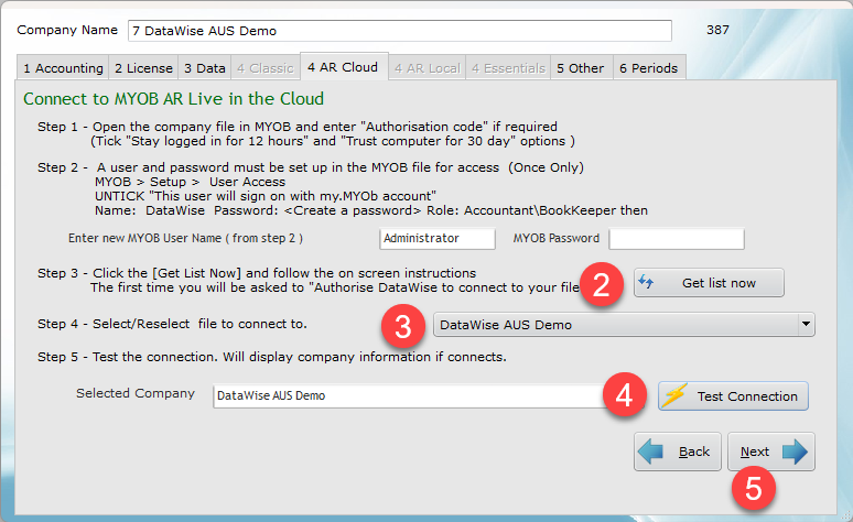 2. Refresh the list of available companies. See Step 3. … Click [ Get List Now] You may get the log into MYOB screens come up. Follow the on screen instructions and click [ Refresh ] button to continue. NB: Please watch carefully as the MYOB login may ask you to [Accept] to allow DataWise to access.